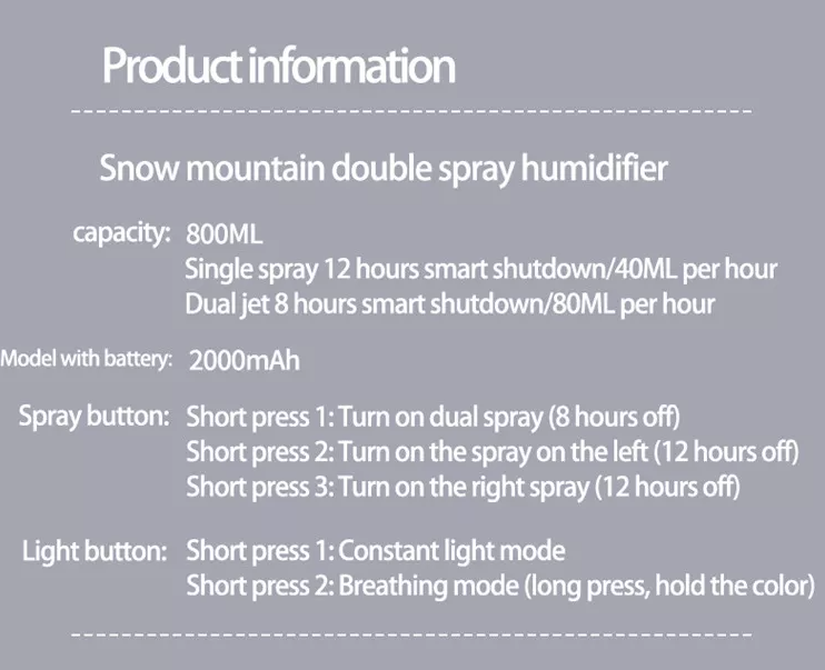 This mini humidifier diffuser comes with 800ml water tank and a colorful romantic night light. It has 2 adjustable spray modes. Press once for constant spray, twice for interval spray.